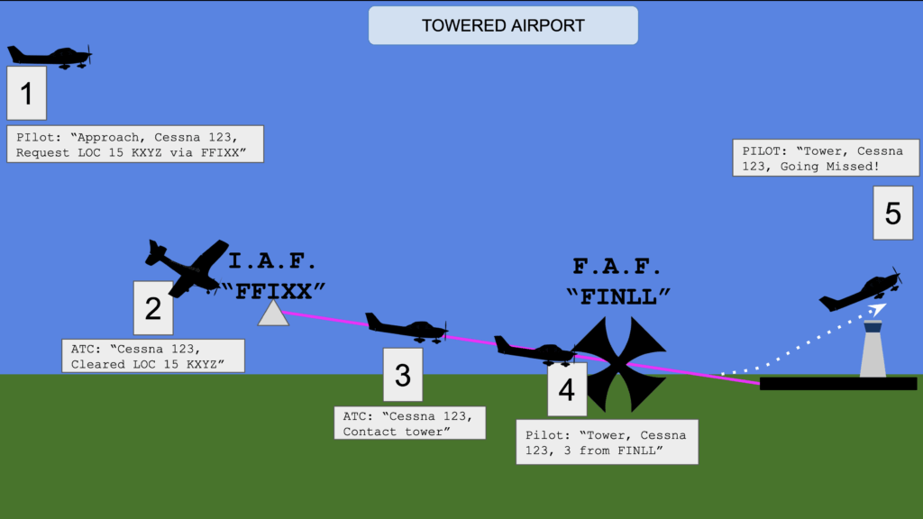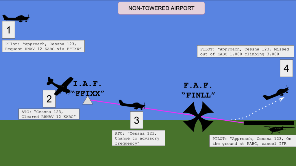 Note: Situational awareness will help the pilot to determine, “what altitude do I descend once established?” -> Here ATC has cleared you for the aproach, so you need to follow the plate. ALT to descend depends on where you are on the approach! If unsure of how to identify position on an aproach or how to interpret a plate, pause here and master that before practicing radio calls.
