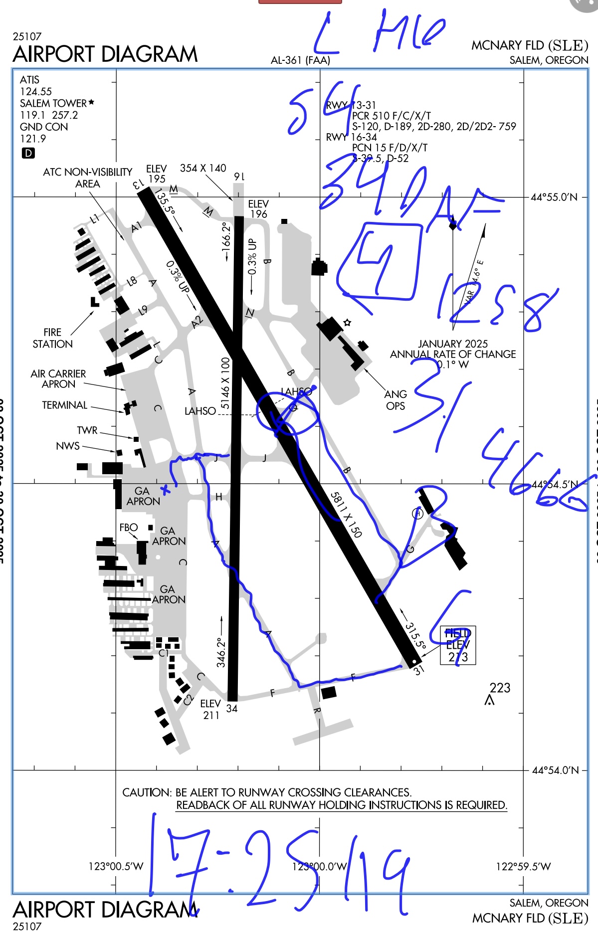 “Salem Four Departure heading 340” -> The Salem Four Departure is a radar vector departure. It notifies us we will be assigned a heading “between 340 clockwise to 130” (because departing RW 31). Today, ATC has assigned our heading with our IFR clearance, but they may wait and assign your heading WITH your takeoff clearance!