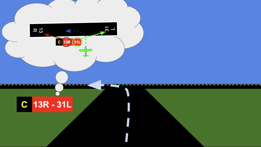 See below a diagram to assist with intersection departures. Its critical to avoid departing in the wrong direction. use this memory aid: The red runway sign corresponds to where the runway numbers are painted on the runway!