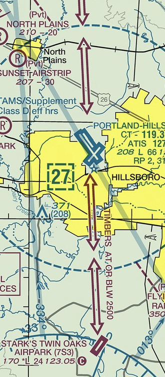 You are the pilot of 5168JV. Its a cloudy day out today! Because of the clouds, you cannot fly above Hillsboros’ Delta airspace. You want to fly through it to the south. You choose to follow the published transition route, the “Timbers Transition”.